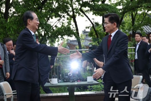 김문수 국민의힘 대통령 후보와 한덕수 무소속 대선 예비후보가 8일 오후 서울 여의도 국회 강변서재에서 '후보 단일화' 회동을 마친 뒤 악수를 나누고 있다. 2025.5.8/뉴스1 ⓒ News1 안은나 기자 |