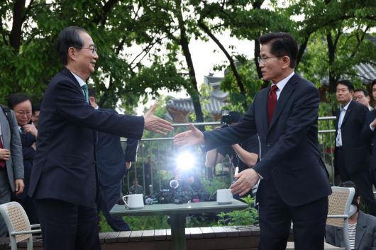김문수 국민의힘 대통령 후보와 한덕수 무소속 대선 예비후보가 8일 오후 서울 여의도 국회 강변서재에서 ‘후보 단일화’ 회동을 마친 뒤 악수를 나누고 있다. 2025.5.8/뉴스1 ⓒ News1 |