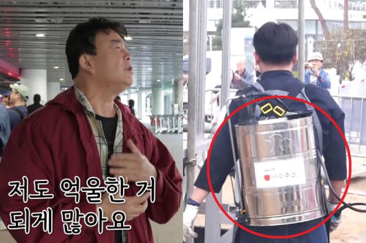 백종원 더본코리아 대표가 자신을 둘러싼 논란에 억울한 부분이 있다고 말하고 있다. 오른쪽은 백 대표가 지역 축제에서 농약통 사용을 지시한 모습. 스튜디오 오재나‧백종원 유튜브 캡처 |