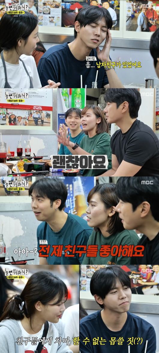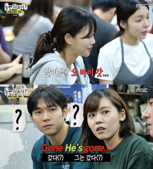 현지에서 만난 홍콩 커플은 청춘인 '놀뭐' 멤버들을 향해 "왜 결혼 안 하냐", "남자친구나 여자친구는 있나"라고 자연스레 물었다. 이에 이미주는 "그는 갔다(He's gone)"라고 서툰 영어로나마 결별 사실을 밝혔다.