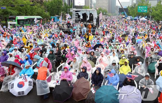 (서울=뉴스1) 신윤하 기자 = 대통령 선거 24일 전인 10일 서울 도심 곳곳에선 비 오는 궂은 날씨에도 불구하고 보수·진보 단체들의 집회가 열렸다. 윤석열 전 대통령 탄핵 국면 당시 각기 다른 목소리를 냈던 이들은 국민의힘의 김문수 대통령 후보 취소 사태를 놓고선 한목소리로 비판했다.