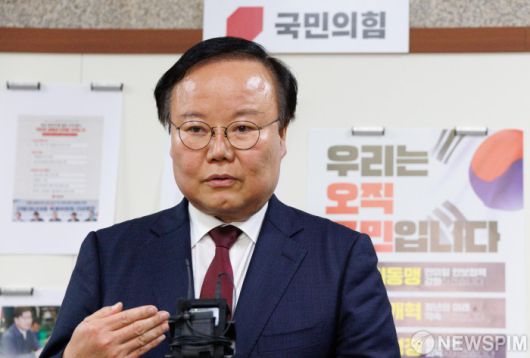 [서울=뉴스핌] 윤창빈 기자 = 김문수 국민의힘 대선 후보 측 김재원 비서실장이 10일 오후 서울 여의도 국회에서 한덕수 예비후보 측과의 협상이 결렬된 후 입장을 밝히고 있다. 2025.05.10 pangbin@newspim.com
