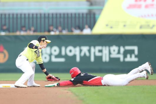 그러자 KIA는 2-2로 맞선 8회 선두 한준수가 볼넷을 골라 나갔다. 홍종표가 대주자로 들어간 기운데, 여기서 양팀의 희비를 가른 나왔다. 박정우의 2루 땅볼 때 정준재가 2루로 던졌다가 타자와 주자가 모두 산 것이다. 송구 거리가 있어 1루로 던지는 게 안전했지만 결국 무사 1,2루가 됐다. 여기서 KIA는 박찬호가 침착하게 희생번트를 대 1사 2,3루를 만들었다.