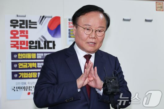 (서울=뉴스1) 안은나 기자 = 김문수 국민의힘 대통령 후보 대리인인 김재원 비서실장이 10일 서울 여의도 국회에서 단일화 협상 관련 한덕수 예비후보 측과 회동을 마친 뒤 브리핑을 하고 있다. 2025.5.10/뉴스1