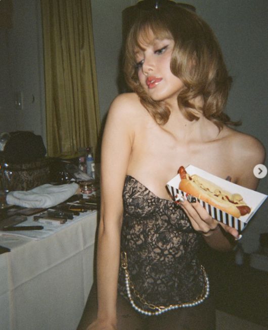 사진 속 리사는 오프숄더 시스루 의상을 입고 한 손에는 핫도그를 든 채로 포즈를 취하고 있다. 이어진 사진 속 리사는 그 위에다 스팽글 재킷을 매치한 채로 힙한 매력을 발산하고 있다.