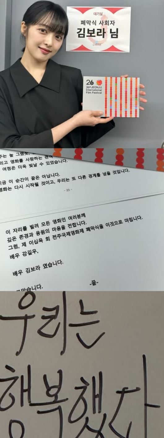 그러나 결혼 1년이 채 안 돼 불과 11개월 만에 파경을 맞은 상황. 그럼에도 김보라는 담담했다. 더불어 단단했다. 그는 이혼이 알려진 이날에도 개인 SNS에 지난 9일 막 내린 제 26회 전주국제영화제 폐막식 사회자로서 소회를 밝혔다. 폐막식 진행 내용이 담긴 큐시트 대본을 게재한 것이다.