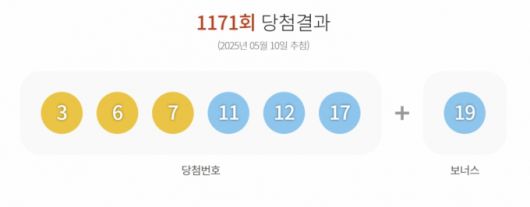 10일 진행한 1171회 로또 1등 당첨번호는 '3·6·7·11·12·17'로 결정됐다. 2등 보너스 번호는 '19'다./사진=동행복권 홈페이지 |