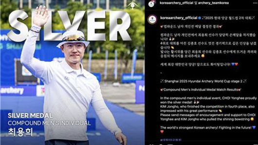 최용희는 중국 상하이에서 열린 2025 현대 월드컵 제2차 대회 닷새째 컴파운드 남자 개인전 결승에서 네덜란드의 마이크 슬루서르에게 147대 144로 패했습니다.