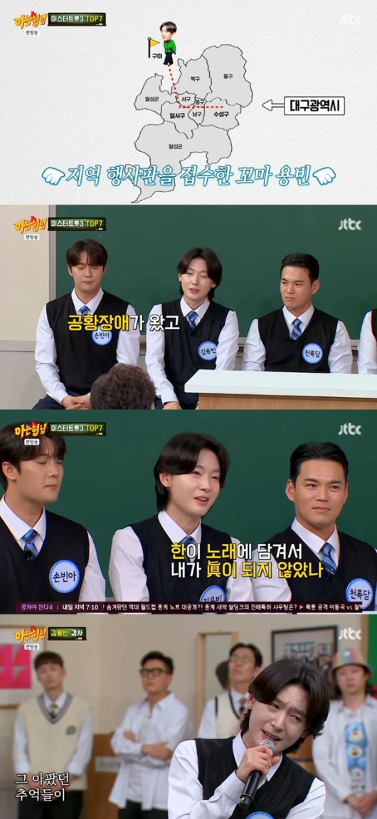 그런가 하면 김용빈은 아팠던 시절에 대해서도 언급했다. 그는 "내가 공황장애를 앓았었다. 그리고 변성기도 와서 한동안 노래를 못하면서 슬럼프가 왔다. 그런 일들을 겪으면서 '미스터트롯3' 진이 됐다"며 역경 많았던 인생사를 고백했다.