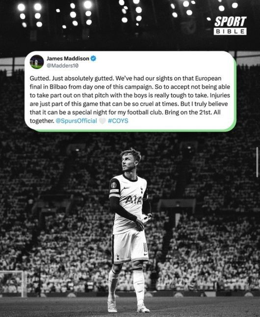 이어 매디슨은 "부상은 그저 이 스포츠의 일부일 뿐이다. 하지만 때때로는 정말 너무나 잔인하다. 하지만 내 팀 토트넘의 특별한 밤이 될 수 있다는 걸 진심으로 믿는다. 21일(결승전) 모두 함께하자. COYS(Come On Your Sprus)"라며 팬들의 응원을 부탁했다.