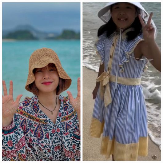딸 로아 역시 스트라이프와 옐로 포인트의 원피스+밀짚 모자로 완벽한 아역 모델 포스를 완성했다. 바닷가를 달리고, 조개껍데기 모래를 만지며 환한 웃음을 짓는 모습이 팬들의 마음을 사로잡았다.