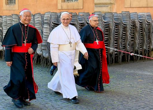 레오 14세 교황(가운데) 모습. 왼쪽은 유흥식 추기경(성직자부 장관). [게티이미지] |
