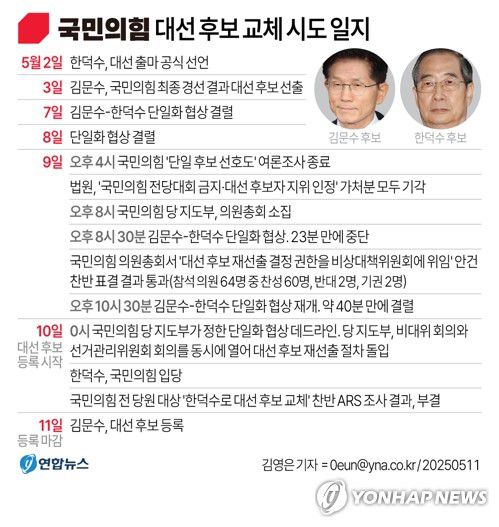 국민의힘 지도부는 당 경선에서 선출된 김문수 후보가 후보 등록 마감일인 11일 이내 한덕수 대선 예비후보와의 단일화를 거부하자, 지난 9일 밤부터 본격적인 후보 교체 절차를 진행했다. 김 후보는 15∼16일 여론조사를 통해 단일화를 하자는 입장이었다.