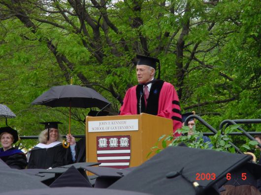 '소프트 파워'로 유명한 조셉 나이 하버드대 석좌교수가 자랑스러워한 경력은 1995년부터 2004년까지 9년간 케네디 행정대학원(HKS)의 학장을 지냈다는 것이다. 나이 학장이 2003년 6월5일 하버드대 전체 졸업식을 마친 후 HKS에서 연설하고 있다./이하원 기자 |