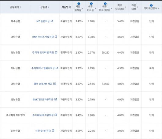 11일 금융감독원 금융상품통합비교공시에 따르면 제주은행 ‘MZ 플랜적금’이 최고 우대금리 5.40%를 제공해 가장 높은 금리를 제공하고 있다. 이 상품의 세전이자율은 3.40%이며 ▲매월 1회 이상 지속적 납입 시(1년제) 0.50%p ▲목표 금액 달성 시 0.50%p ▲신용·체크카드 합산 사용액 월 10만원 이상 사용 시 0.50%p ▲‘청년이니까응원합니다’ 이벤트 참여 시 0.50%p가 우대금리로 제공된다. 월 납입한도는 30만원 이하다.