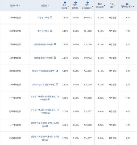 이어 진주저축은행의 '안심정기예금(진주,통영) (창구전용)'과 '정기예금(진주,통영)', '지니뱅크-정기예금(비대면)', '회전정기예금(진주,통영)' 등은 3.01%의 세전이자율을 제공하며 뒤를 이었다.