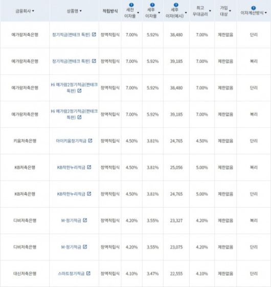 11일 금융감독원 금융상품통합비교공시에 따르면 저축은행 12개월 정기적금 가운데 세전 이자율 기준 기본 금리가 가장 높은 상품은 예가람저축은행의 '정기적금(짠테크 특판)'과 'Hi 예가람e정기적금(짠테크 특판)'으로 연 7.00%를 제공한다.