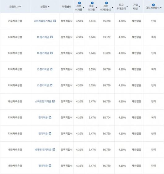 이어 DB저축은행의 'M-정기적금'이 4.30%의 세전이자율을 제공하며 뒤를 이었다.