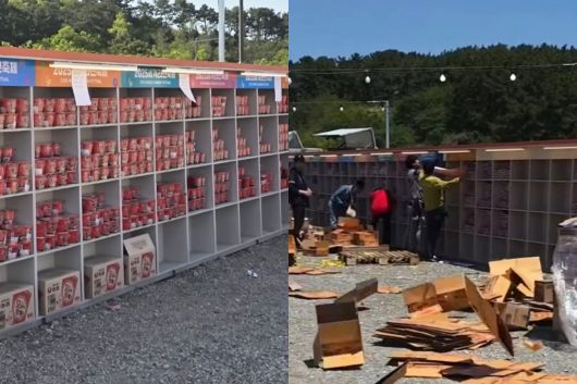 실제 사회관계망서비스(SNS) 등에 올라온 후기 사진과 영상에는 휑한 현장 모습이 담겼다. 진열대에 듬성듬성 놓인 컵라면과 모래와 자갈이 섞인 바닥에 라면 박스가 뒹구는 모습도 포착됐다.