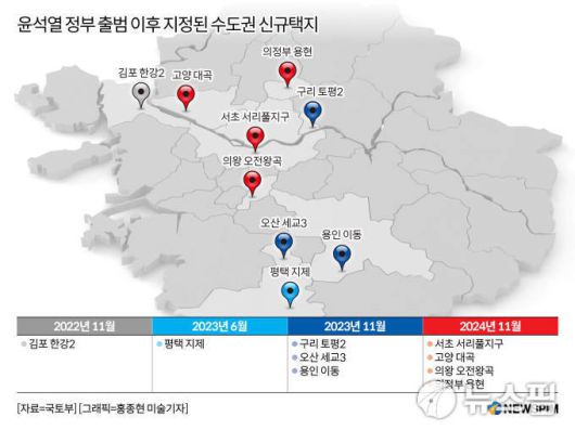 실제로 윤석열 정부 들어 수도권 내에 지정된 신규택지 9곳에 달한다. 2022년 11월 김포한강2 지구를 시작으로 2023년 6월 평택지제 공공주택지구, 2023년 11월 구리토평2 공공주택지구, 오산세교3 공공주택지구, 용인이동 공공주택지구, 2024년 11월 서울 서초구 서리풀지구, 경기도 고양 대곡역세권, 의정부 용현, 의왕 오전왕곡 등이다.