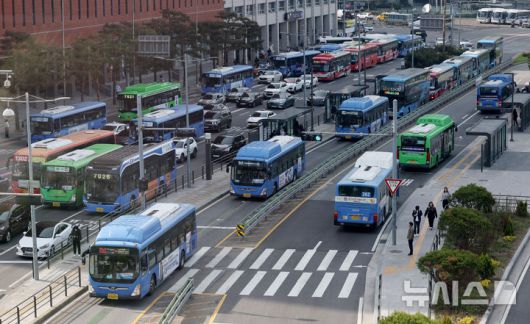[서울=뉴시스] 김진아 기자 = 사측과의 임금·단체협약 협상이 결렬된 서울 시내버스 노조가 이틀째 준법 투쟁을 이어간 지난 8일 서울역 앞 버스환승센터 정류장에 버스들이 줄지어 서 있는 모습. 2025.05.08. bluesoda@newsis.com |