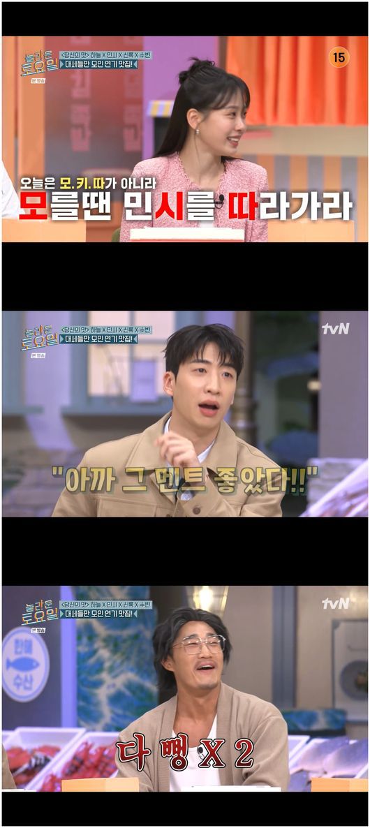 강하늘에 대해 고민시와 함께 칭찬을 건넨 건 김신록도 마찬가지였다. 김신록은 “제가 예습을 해 봤는데, 어렵더라. 저는 안 들리면 하늘이를 따라가겠다. 근데 만약 하늘이랑 민시가 의견이 다르다? 그러면 고민시를 따라가겠다”라고 말했다.