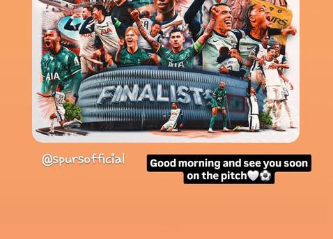 그는 토트넘의 2024-2025 유럽축구연맹(UEFA) 유로파리그 결승 진출 기념 포스터를 공유하면서 "좋은 아침입니다. 조만간 피치에서 만나요"라는 글을 남겼다.