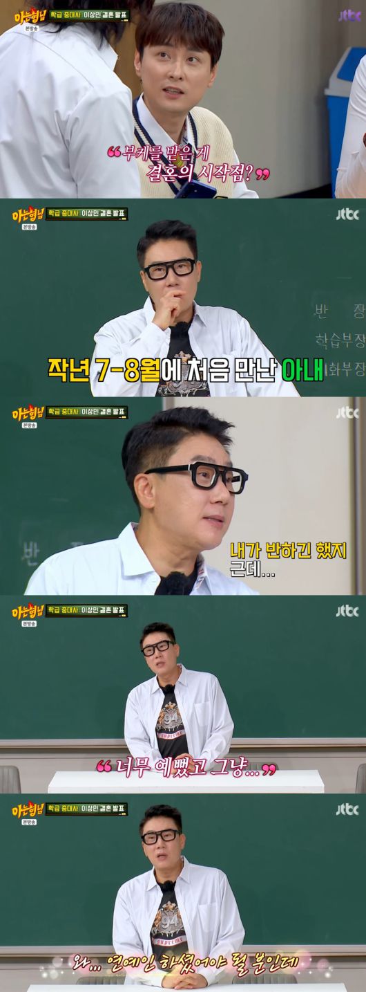 마침내 등장한 이상민은 축하의 박수를 받으며 결혼과 관련된 최초의 러브스토리를 공개했다. 아내와 언제 만났냐는 말에 그는 "작년 7-8월에 처음 만났다. 작년에는 아예 (얼굴만) 아는 사이였지 연락을 주고 받는 사이가 아니였다"고 운을 뗐다.