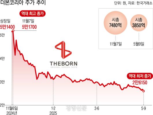 이날 유가증권시장(코스피)에서 더본코리아는 주당 2만6150원에 거래를 마감했습니다. 역대 최저 종가를 경신했습니다. 상장 다음날이었던 지난해 11월7일 기록한 역대 최고 종가(5만1700원)와 비교하면 약 6개월 만에 49.4%나 폭락했습니다. 약 7500억원에 달했던 시가총액도 약 3600억원이 증발했죠.