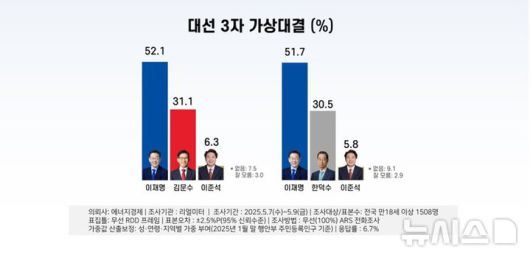 리얼미터가 에너지경제신문 의뢰로 지난 7~9일 전국 만 18세 이상 유권자 1508명을 대상으로 대선 3자 가상 대결(95% 신뢰수준에 ±2.5%포인트)을 한 결과 이 후보 52.1%, 김문수 후보 31.1%, 이준석 후보 6.3%를 기록했다.