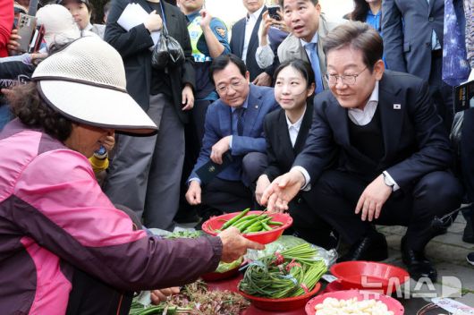 [함안=뉴시스] 조성우 기자 = 민심을 청취하는 '경청 투어'에 나선 이재명 더불어민주당 대선후보가 10일 경남 함안군 가야시장에서 한 상인에게 고추를 구매하고 있다. 2025.05.10. xconfind@newsis.com |