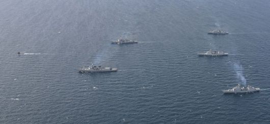 한미 해군은 지난 8일부터 11일까지 동해에서 한미 해군의 압도적인 전력으로 적의 해상도발에 대한 즉각적인 대응태세를 확립하고 연합작전 수행능력을 강화하기 위한 연합 해상훈련을 실시한 가운데 한미 연합 해군이 5월 8일 전술기동을 하고 있다.(함정 기동 방향 기준 앞쪽 윗줄부터 잠수함(SS-II), 미 해군 윌리엄로렌스함(DDG), 율곡이이함(DDG), 양만춘함(DDH-Ⅰ), 대조영함(DDH-II), 광개토대왕함(DDH-Ⅰ) 해군 제공 |