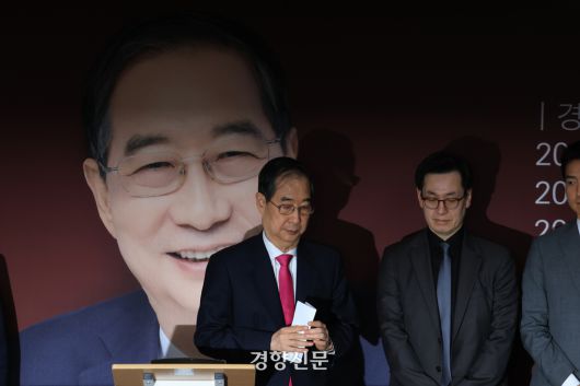 분홍색 넥타이를 착용한 한 전 총리는 입장문을 40여초 간 읽은 뒤 출입기자들과 일일이 악수하고 캠프 사무실을 떠났다. 한 전 총리는 별도의 질의응답을 진행하지 않았다.