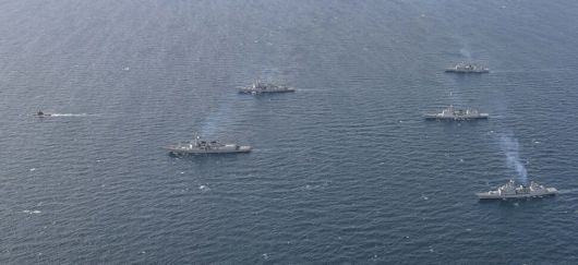 한미 해군은 8∼11일 동해에서 연합 해상훈련을 실시했다. 지난 8일 한미 함정이 전술기동하는 모습. 함정 기동 방향 기준 앞쪽 윗줄부터 잠수함(SS-Ⅱ), 미 해군 윌리엄로렌스함(DDG), 율곡이이함(DDG), 양만춘함(DDH-Ⅰ), 대조영함(DDH-Ⅱ), 광개토대왕함(DDH-Ⅰ). 해군 제공 |