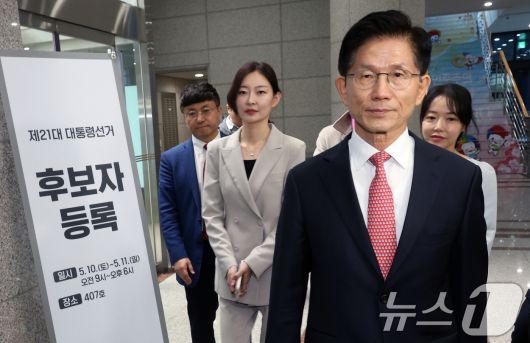 (과천=뉴스1) 오대일 기자 = 김문수 국민의힘 대통령 후보가 11일 오전 경기도 과천 중앙선거관리위원회에서 제21대 대통령 선거 후보 등록을 마친 뒤 자리를 뜨고 있다. (공동취재) 2025.5.11/뉴스1