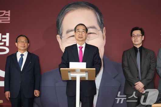 (서울=뉴스1) 이광호 기자 = 국민의힘 대선후보로 등록했던 한덕수 전 국무총리가 11일 오전 서울 여의도 캠프 사무실에서 기자회견을 열고 국민의힘 대통령 후보 변경을 위한 당원 투표가 부결된 것과 관련해 "모든 것을 겸허하게 수용하고 승복하겠다"고 입장을 밝히고 있다. 2025.5.11/뉴스1