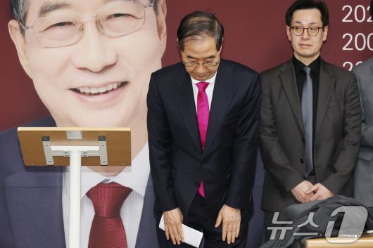 (서울=뉴스1) 이광호 기자 = 국민의힘 대선후보로 등록했던 한덕수 전 국무총리가 11일 오전 서울 여의도 캠프 사무실에서 국민의힘 대통령 후보 변경을 위한 당원 투표가 부결된 것과 관련해 "모든 것을 겸허하게 수용하고 승복하겠다"고 입장을 밝힌뒤 인사하고 있다. 2025.5.11/뉴스1