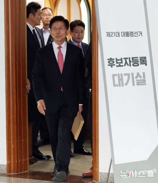 [과천=뉴시스] 권창회 기자 = 김문수 국민의힘 대선 후보가 11일 오전 경기 과천시 중앙선거관리위원회에서 제21대 대통령선거 후보 등록을 위해 입장하고 있다. (공동취재) 2025.05.11. photo@newsis.com |