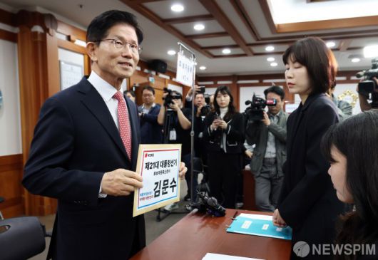 [서울=뉴스핌] 양윤모 기자 = 김문수 국민의힘 대선 후보가 11일 오전 경기 과천 중앙선거관리위원회에서 제21대 대통령 선거 후보자 등록 서류를 제출하고 있다.국민의힘은 10일 김문수 대선 후보를 한덕수 후보로 교체하는 찬반을 묻는 전 당원 투표를 한 결과, 반대 의견이 찬성보다 많아 부결됐다고 밝혔다. [공동취재] 2025.05.11 yym58@newspim.com