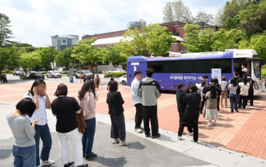 7일 강원 춘천시 강원대학교에서 SK텔레콤 찾아가는 서비스 버스가 유심 교체 서비스를 제공하자 학생 및 시민들이 줄지어 기다리고 있다.(사진=연합뉴스) |