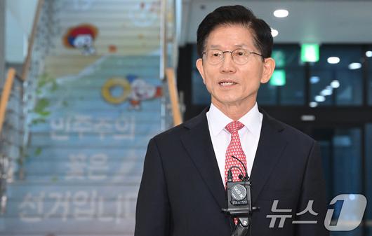 (과천=뉴스1) 오대일 기자 = 김문수 국민의힘 대통령 후보가 11일 오전 경기 과천시 중앙선거관리위원회에서 제21대 대통령선거 후보자 등록을 마친 뒤 취재진의 질문에 답하고 있다. (공동취재) 2025.5.11/뉴스1