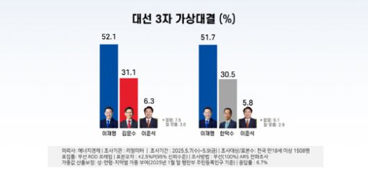 리얼미터가 에너지경제신문 의뢰로 지난 7~9일 전국 만 18세 이상 유권자 1508명을 대상으로 대선 3자 가상 대결(95% 신뢰수준에 ±2.5%포인트)을 한 결과 이재명 후보 52.1%, 김문수 국민의힘 후보 31.1%, 이준석 개혁신당 후보 6.3%로 나타났다.
