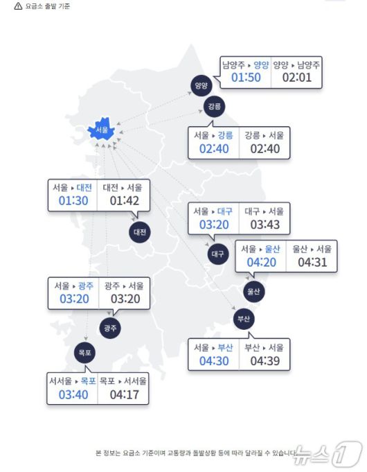 같은 시각 지방 도시에서 서울까지는 △부산 4시간 39분 △울산 4시간 31분 △강릉 2시간 40분 △양양 2시간 1분(남양주 도착) △대전 1시간 42분 △광주 3시간 20분 △목포 4시간 17분(서서울 도착) △대구 3시간 43분이다.