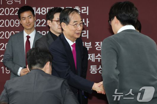 (서울=뉴스1) 이광호 기자 = 국민의힘 대선후보로 등록했던 한덕수 전 국무총리가 11일 오전 서울 여의도 캠프 사무실에서 국민의힘 대통령 후보 변경을 위한 당원 투표가 부결된 것과 관련해 입장을 밝힌뒤 취재진과 인사나누고 있다. 2025.5.11/뉴스1skitsch@news1.krCopyright ⓒ 뉴스1. All rights reserved. 무단 전재 및 재배포, AI학습 이용 금지.