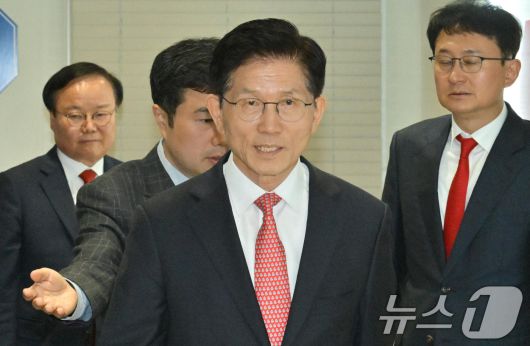 (서울=뉴스1) 이광호 기자 = 김문수 국민의힘 대통령 후보가 11일 오전 한덕수 전 국무총리와의 회동을 위해 서울 여의도 중앙당사에서 대통령후보실로 이동하고 있다.(공동취재) 2025.5.11/뉴스1skitsch@news1.krCopyright ⓒ 뉴스1. All rights reserved. 무단 전재 및 재배포, AI학습 이용 금지.