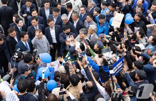 (화순=뉴스1) 이재명 기자 = 경청투어에 나선 이재명 더불어민주당 대통령 후보가 11일 오전 전남 화순군 화순읍 화순교 일대에서 시민들과 인사를 나누고 있다. 2025.5.11/뉴스1