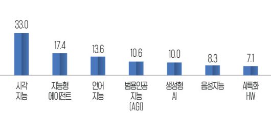 11일 소프트웨어정책연구소(SPRi)가 올해 공개한 '2024 인공지능산업 실태조사'에 따르면 모집단 전체에서 가장 많은 기업이 보유한 인공지능 기술 분야는 '시각 지능'(33%)이었다. 이어 '지능형 에이전트'(17.4%), '언어 지능'(13.6%), '범용인공지능'(10.6%), '생성형 AI'(10%), '음성지능'(8.3%), 'AI 특화 하드웨어'(7.1%) 순이었다.