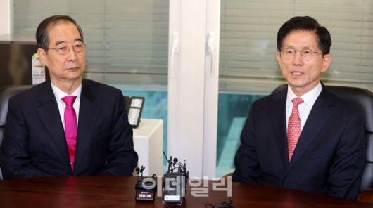 [이데일리 방인권 기자] 김문수 국민의힘 대선후보와 한덕수 전 국무총리가 11일 서울 여의도 국민의힘 대선후보 사무실에서 회동을 갖고 있다.