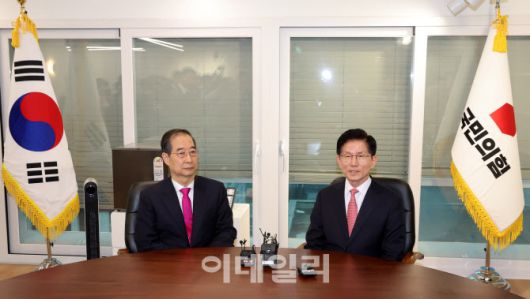 [이데일리 방인권 기자] 김문수 국민의힘 대선후보(오른쪽)와 한덕수 전 국무총리가 11일 서울 여의도 국민의힘 대선후보 사무실에서 회동을 하고 있다.