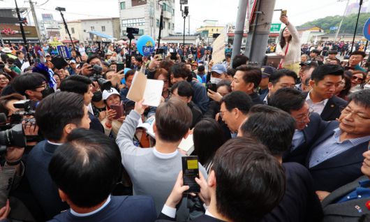 남도문화벨트 골목골목 경청투어에 나선 더불어민주당 이재명 대선 후보가 11일 전남 화순군 화순읍에서 지지자들과 인사하며 이동하고 있다. /연합 |